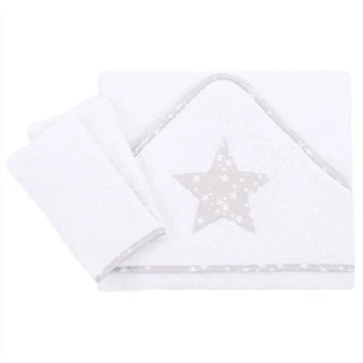 babybay Hood Towel 100x100 cm incl. Two washcloth,White Application Star Pearl Grey