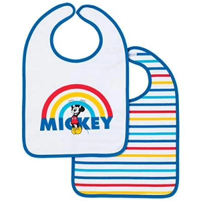 Amazon MarketplaceA rainbow multi-coloured striped bib Set of two cotton bibs lined with sponge with the effigy of mickey mouse A white and navy blue bib with mickey rainbow print Soft velcro closure to respect baby's sensitive skin