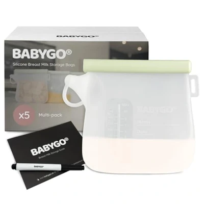 BABYGO® Reusable Silicone Breast Milk Storage Bags (5 Pack) BPA Free, Leak Proof, Freezer Safe with Measurement Scale, Easy Pour Spout, Flat Freeze Design for