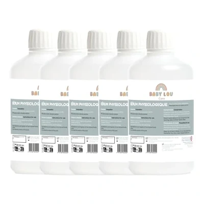 BABY SALINE SOLUTION | This irrigation solution is primarily recommended for the hygiene of the nose and eyes, whether for babies, children, or adults. It helps remove secretions that may sometimes accumulate around the nostrils or in the corners of the eyes, making it perfectly suitable for daily nasal and eye cleansing. NASAL HYGIENE | BABYLOU Care saline solution in a bottle helps to loosen mucus, moisturize the nasal mucous membranes, and restore breathing comfort. It is also effective in clearing the nasal passages of impurities, allergens, dust, and pollution particles. 100% FRENCH MADE & ECONOMICAL FORMAT | BABYLOU Care saline solution is manufactured in France, in Lozère. Its economical 1-liter bottle format is equivalent to about 200 single doses. DIRECTIONS FOR USE | Nasal nebulization (from 4 months of age in infants) and irrigation of non-injured body surfaces. CONTENT | 5 bottles of BABYLOU Care Saline Solution – 5 x 500 ml