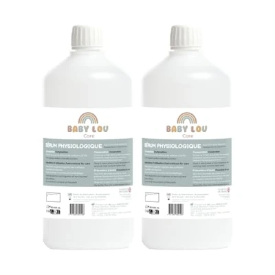 BABY PHYSIOLOGICAL SALINE | This irrigation solution is primarily recommended for nose and eye hygiene, whether for babies, children, or adults. It helps remove secretions that sometimes build up around the nostrils or in the corners of the eyes, making it perfectly suitable for daily nasal and eye cleansing. NASAL HYGIENE | BABYLOU Care saline solution in bottle form helps loosen mucus, moisturize the nasal mucosa, and restore breathing comfort. It is also effective in clearing the nasal cavities of impurities, allergens, dust, and pollution particles. 100% FRENCH MADE & ECONOMICAL FORMAT | BABYLOU Care saline solution is manufactured in France, in Lozère. Its economical 1-liter bottle format is equivalent to 200 single doses. DIRECTIONS FOR USE | Nasal nebulization (from 4 months of age in infants) and irrigation of unbroken skin surfaces. CONTENT | 2 bottles of BABYLOU Care saline solution – 2 x 1 liter