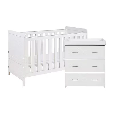 ✅ 𝐂𝐚𝐫𝐨 𝐂𝐨𝐭 𝐁𝐞𝐝: Suitable from birth to around 5 years, this cot bed comes with 3 height adjustable mattress positions and teething rails ensure safety. It can also be converted into a bed and requires a mattress of size 140 x 70 cm (not included) ✅ 𝐔𝐧𝐢𝐯𝐞𝐫𝐬𝐚𝐥 𝐂𝐡𝐞𝐬𝐭 𝐂𝐡𝐚𝐧𝐠𝐞𝐫: The three full-sized drawers provide ample space for organizing your baby's essentials. The chest changer has an age suitability for a maximum weight of 11kg, and the changing mat size is 75 x 45 cm (not included). ✅ 𝐂𝐨𝐦𝐩𝐫𝐞𝐡𝐞𝐧𝐬𝐢𝐯𝐞 𝐍𝐮𝐫𝐬𝐞𝐫𝐲 𝐑𝐨𝐨𝐦 𝐒𝐞𝐭: The 2 Piece Nursery Room Set combines the Caro Cot Bed and the Universal Chest Changer, creating a comprehensive solution for your baby's nursery. This set is designed to cater to your baby's needs from birth to around 5 years. ✅ 𝐃𝐢𝐦𝐞𝐧𝐬𝐢𝐨𝐧𝐬: The assembled size of Caro Cot Bed is L 145 x D 76 x H 84 cm and the assembled size of Universal Chest Changer is L 80 x D 50 x H 90 cm. With this 2 Piece Nursery Room Set, you can create a comfortable and organized space for your baby's early years. ✅ 𝐂𝐮𝐬𝐭𝐨𝐦𝐞𝐫 𝐒𝐚𝐭𝐢𝐬𝐟𝐚𝐜𝐭𝐢𝐨𝐧: Babymore believes in providing the best care to our customers by providing stylish and high-quality products. Our Caro 2 piece room set is made with high-quality materials. We are at your service in case of any queries related to the product.