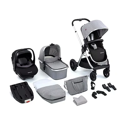 Babymore Memore V2 Travel System 13 Piece Silver 3 in 1 Pram System, Foldable, Reclining Baby Pushchair, Premium Pecan i Size Car Seat with ISOFIX Base & Essentials, 0 4 Years Up to 22 Kg
