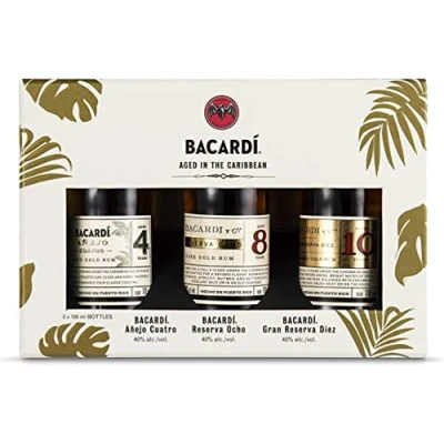 This beautiful gift pack includes 3 x 10cl bottles of delicious Bacardi aged rums to discover; a 4 yr old rum (Cuatro), 8yr old rum (Ocho) and a 10yr old rum (Diez) Bacardi Anejo Cuatro is a blend of rums aged for a minimum of four years under the Caribbean sun. It has a soft, golden colour & tasting notes of mild vanilla, toasted oak, clove and honey Bacardi Ocho, also known as "The Family Reserve", is inspired by a family recipe from 1862. It is a complex golden rum with a deep, layered and mellow flavour of dried fruits, spices and vanilla Bacardi Diez, is barrel-aged for a minimum of ten years & then charcoal filtered for a smooth finish. Discover bright notes of stone fruits, banana and pear balanced with caramelized vanilla and oak The ideal gift for someone who enjoys rum