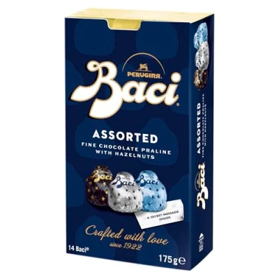 PACKAGING MAY VARY: Please be aware, packaging may vary, but the indulgent taste and premium quality of Baci chocolates remain consistent DECADENT: A delightful assortment of dark and milk chocolate truffles, perfect for those who love variety and a touch of elegance CELEBRATE: Ideal for gifting, Baci chocolates make any occasion special with their luxurious taste and thoughtful presentation, or a tasty treat for yourself INDULGE: Each bite delivers a fantastical combination of rich and classic flavours that will bring ultimate chocolate satisfaction SENT WITH LOVE: Spark some emotions with the surprise “love note” on the inside of the truffles in this chocolate hazelnut box; Delight the palate with this high quality chocolate and share a special moment with messages meant to show how much you care