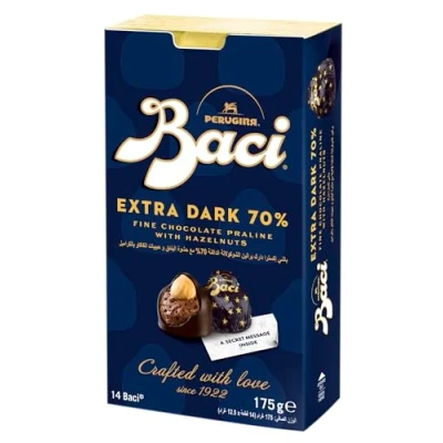 PACKAGING MAY VARY: Please be aware, packaging may vary, but the indulgent taste and premium quality of Baci chocolates remain consistent DECADENT: Delight in the intense flavour of extra dark chocolate and the crunch of a whole hazelnut – the perfect gift for dark chocolate lovers CELEBRATE: Ideal for gifting, Baci chocolates make any occasion special with their luxurious taste and thoughtful presentation, or a tasty treat for yourself INDULGE: Each bite delivers a fantastical combination of rich and classic flavours that will bring ultimate chocolate satisfaction SENT WITH LOVE: Spark some emotions with the surprise “love note” on the inside of the truffles in this chocolate hazelnut box; Delight the palate with this high quality chocolate and share a special moment with messages meant to show how much you care