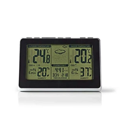 INDOOR & OUTDOOR WEATHER MONITORING – This versatile Nedis wireless weather station provides information about the indoor and outdoor temperature, humidity, and expected weather conditions for full daily insight INTEGRATED ALARM CLOCK FUNCTION – Doubles as an alarm clock with snooze, time and date functions, so come rain or shine, you’ll always be up and out of bed on time BATTERY-POWERED STYLISH DISPLAY – The sleek and stylish display unit features a blue backlight and can be placed anywhere in your home, operating with 3x AAA batteries (not included) WIRELESS OUTDOOR SENSOR – The outdoor sensor can be sited anywhere within your garden and transmits six levels of weather data to the indoor unit via a 433 MHz signal (2x AA batteries not included) REMOTE CONTROL COMPATIBILITY – Can be controlled remotely with an optional radio controller (not included), allowing flexible management from across the room