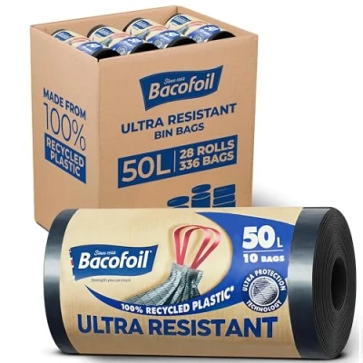 Bacofoil Ultra Resistant Bin Liners with Drawstring Handles 50L Leak Proof and Tear Bag Protection Technology (28 Rolls, 280 Bags)