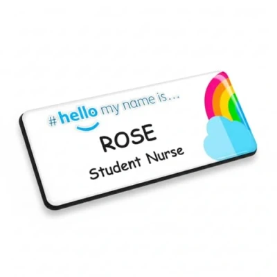 Badgemaster Blue Hello My Name is Half Rainbow Right Personalised Premium Domed Bespoke Custom Badge 76 x 32mm White/White
