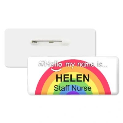 Badgemaster Central Hello My Name is Rounded Rainbow Personalised Premium Domed Bespoke Custom Badge 76 x 32mm White/White