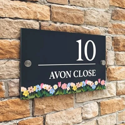 Badgemaster Floral Modern Anthracite House Number Sign Plaque Stainless Steel Standoffs 20cm x 13cm Flower Border Bottom