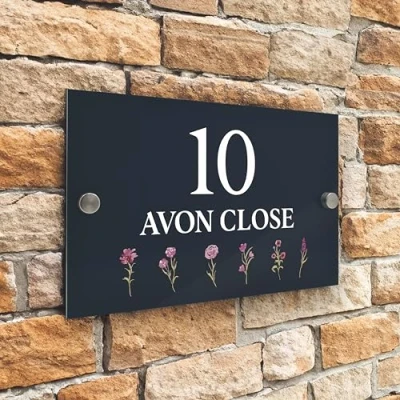 Badgemaster Floral Modern Anthracite House Number Sign Plaque Stainless Steel Standoffs 20cm x 13cm Pink Flowers Bottom