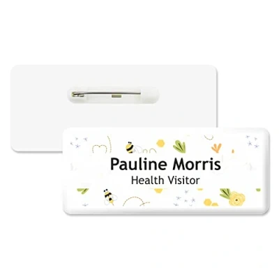 Badgemaster Hello My Name is Bees Hearts Leaves Pattern Text Personalised Premium Domed Bespoke Custom Badge 76 x 32mm White