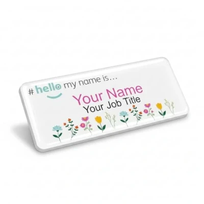Badgemaster Hello My Name is Flowers Decorated Badge Premium Domed White 76 x 32mm Doctor Student Nurse Clinical Practitioner Healthcare Assistant Medical Staff GP