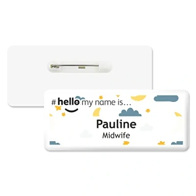 Badgemaster Hello My Name is Gold Stars Moon Pattern Text Personalised Premium Domed Bespoke Custom Badge 76 x 32mm White