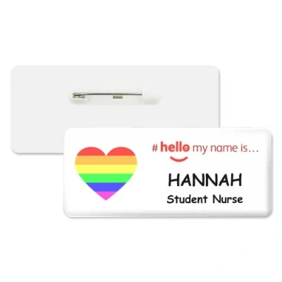 Badgemaster Hello My Name is Horizontal Rainbow Stripped Heart Left Personalised Premium Domed Bespoke Custom Badge 76 x 32mm White/White