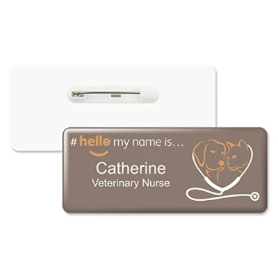 Badgemaster Hello My Name is Logo Brown Stethoscope Vet Badge Premium Domed White 76 x 32mm Doctor Student Nurse Clinical Practitioner Healthcare Assistant Medical Staff GP