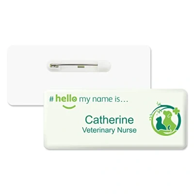 Badgemaster Hello My Name is Logo Green Tree Vet Badge Premium Domed White 76 x 32mm Doctor Student Nurse Clinical Practitioner Healthcare Assistant Medical Staff GP