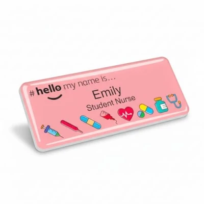 Badgemaster Hello My Name is Logo Pink Supplies Badge Premium Domed White 76 x 32mm Doctor Student Nurse Clinical Practitioner Healthcare Assistant Medical Staff GP