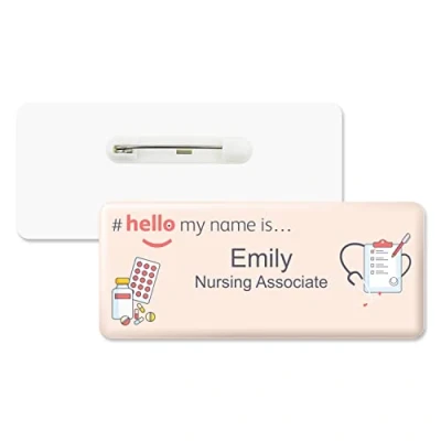 Badgemaster Hello My Name is Logo Pink Tablets Badge Premium Domed White 76 x 32mm Doctor Student Nurse Clinical Practitioner Healthcare Assistant Medical Staff GP