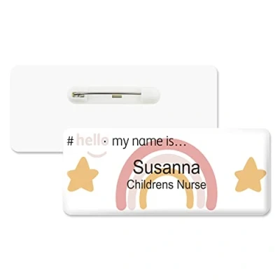 Badgemaster Hello My Name is Logo Rainbow and Stars Badge Premium Domed White 76 x 32mm Doctor Student Nurse Clinical Practitioner Healthcare Assistant Medical Staff GP