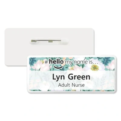 Badgemaster Hello My Name is Multi Coloured Flowers Teal Background Personalised Premium Domed Bespoke Custom Badge 76 x 32mm White/White