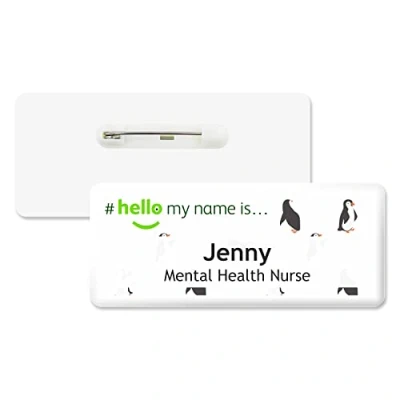 Badgemaster Hello My Name is Penguin Pattern Text Personalised Premium Domed Bespoke Custom Badge 76 x 32mm White