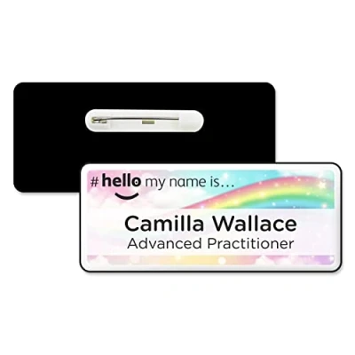 Badgemaster Hello My Name is Pink Blue Sky Shining Rainbow Background Personalised Premium Domed Bespoke Custom Badge 76 x 32mm White/Black