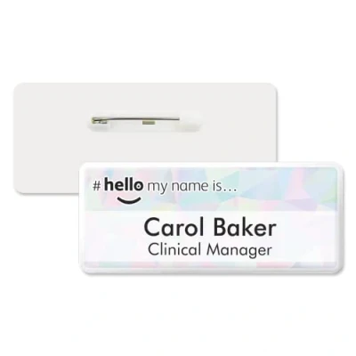 Badgemaster Hello My Name is Pink Blue Triangles Pattern Personalised Premium Domed Bespoke Custom Badge 76 x 32mm White/White