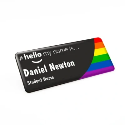 Badgemaster Hello My Name is Rainbow Curved Black Personalised Premium Domed Bespoke Custom Badge 76 x 32mm White