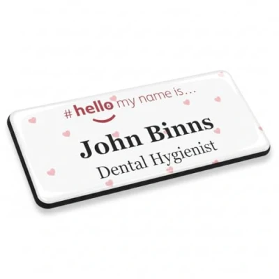 Badgemaster Hello My Name is Small Hearts Background Personalised Premium Domed Bespoke Custom Badge 76 x 32mm White/White