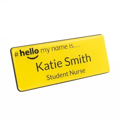 Badgemaster Hello My Name is Yellow Badge Premium Domed Black 76 x 32mm GP Practitioner Doctor Healthcare Nurse Medical Staff Clinical Student Assistant