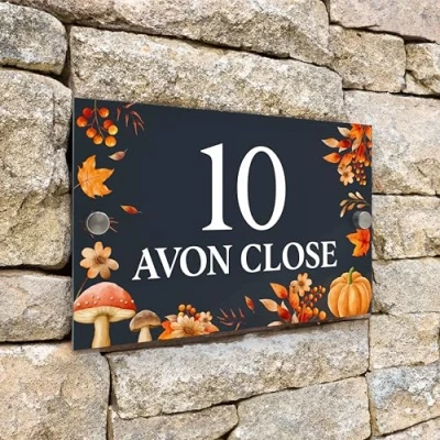 Badgemaster Modern Anthracite House Number Sign Plaque Stainless Steel Standoffs 20cm x 13cm Autumn Fall Pumpkin Mushroom Leaves
