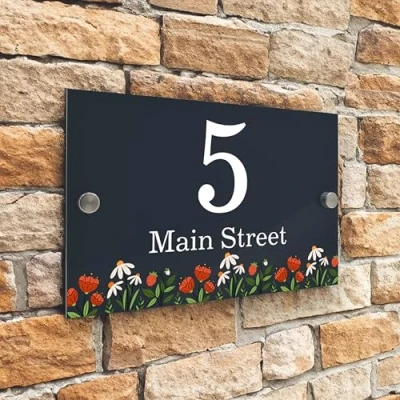 Badgemaster Modern Anthracite House Number Sign Plaque Stainless Steel Standoffs 20cm x 13cm Flowers Meadow