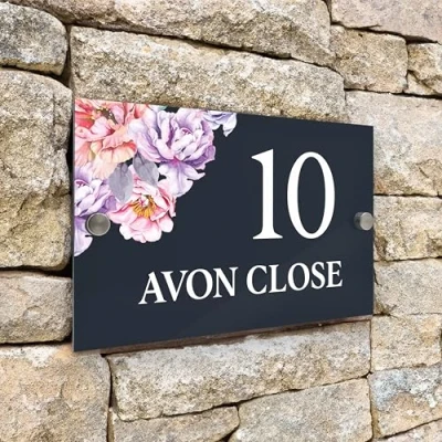 Badgemaster Modern Anthracite House Number Sign Plaque Stainless Steel Standoffs 20cm x 13cm Large Peony Flowers