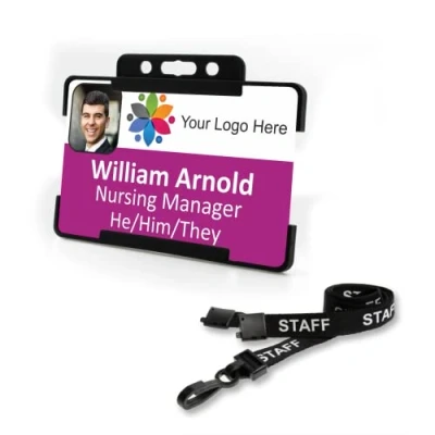 Badgemaster Multi Coloured Personalised Your Logo Business Professional Photo ID Black Rigid Card Holder and Staff Lanyard CR80 (Purple)