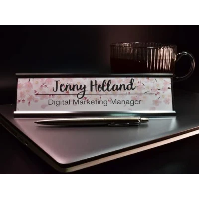 Badgemaster Personalised Pink Cherry Blossom Desk Plaque with Black Name and Job Title Gold Silver Stand Modern Stylish Accessories