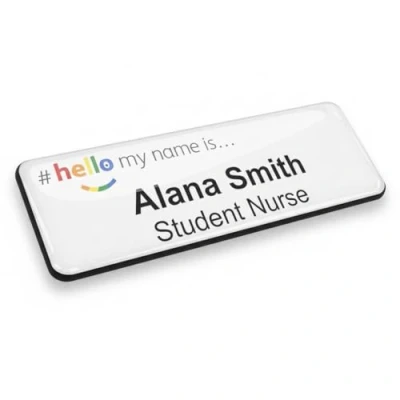 Customise the badge with the “Customise Now” button. Choose the font, enter the information required on the badge and choose the perfect fastener for you. With a choice of 4 different fasteners the badge is perfect for medical staff. The options include a normal pin, crocodile clip, a magnetic fastener, and a plastic-coated magnetic fastener. Clear polyurethane domed finish adds a layer of protection and professionalism, providing depth and a 3D look to your name badge. All our badges are finished to the highest quality, and as all our badge manufacturing is done in our purpose-built facility. Adding a clear domed finish to a simple plain text name badge gives it that professional look as well as protection against accidental scratches.