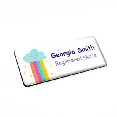 Badgemaster Rainbow Rain Cloud Personalised Premium Domed Bespoke Custom Name Badge 76 x 32mm White Black