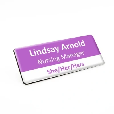 Badgemaster Simple Low White Pastel Purple Surgery Dentist Practice Medical Name Badge with Pronouns and Job Title 76 x 32mm Mid White/Black Material Pin Magnet Clip Fastener