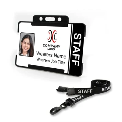 Badgemaster White Black Staff Right Vertical Stripe Your Logo Personalised Business Professional Photo ID with Rigid Card Holder and Lanyard CR80