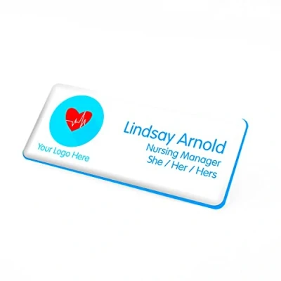 Badgemaster Your Healthcare Logo White/Light Blue Name Badge with Job Title and Pronouns Premium Domed 76 x 32mm Material Pin Magnet Clip Fastener