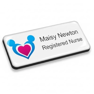 Fully custom name badge, your business logo, names and job titles. The clear polyurethane domed finish adds a layer of protection and professionalism, providing depth and a 3D look to your name badge. All our badges are finished to the highest quality, and as all our badge manufacturing is done in our purpose-built facility. Size 76x x 32mm with 3mm corners. White Black Material.
