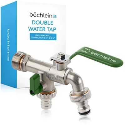 Bächlein Universal Double Outlet Tap for The Garden [Green] incl. 2 Hose Connections Noble Water with 1/2 and 3/4 Inch Connection, Ball Valve