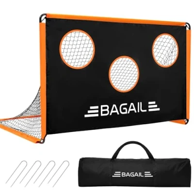 【Ideal Size】The Bagail portable football goal measures 180x120x120cm (6 x 4 x4 ft) when fully extended and can be put into a 80cm long carry bag (included) after disassembl. Great for kids and teenagers for football games and accuracy practice. Have fun at home, in the yard, on the beach or anywhere on the grass. 【2-in-1 Design】The main part of the football goal is a recreational sports goal and a removable target cloth. With the target on, it can be set up in the backyard or on the grass for personal shooting accuracy practice or skill training; without the target, it can be a goal for children's football or hockey games. Explore more fun. 【Tool-free Installation】No tools are required to assemble the soccer goal. The entire installation process can be easily completed in just 10 minutes. Follow the instruction manual, connect the numbered steel pipes in sequence, and pass the steel pipes through the fabric sleeve of the net. Use the included ground spikes to secure the goal. Then all things left is to have fun. 【Portable Carry Bag】A sturdy nylon tote bag is provided. You can easily disassemble the football goal and store it into the protable carry bag. The compact and lightweight sports net enables your child to have fun anytime, anywhere. An amazing portable goal net for your kids. 【Strong and Stable】The thickened coated tube (19mm in diameter), tough polyester mesh, double-stitched 450D Oxford cloth sleeve and four reinforced ground spikes together make the BAGAIL football goal sturdy and stable, calmly facing strong winds and high-intensity shooting impacts and standing firm.
