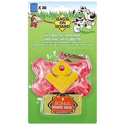 New Dookie Dock for hands-free poop bag holding when your dog has done its business, and metal carabiner for easier, more secure attachment to lead Bags on Board Pink Marble Bone Dog Waste Bag Dispenser with 30 bags makes picking up after your dog simple and quick Sturdy, compact dog poop bag dispenser holds 15 large dog poop bags, and when it's time to refill, simply twist off the top and reload Bags on Board Dispensers attach to any standard or retractable leash, so you'll always have poop bag when you need it Bags have double-sealed seams to make them stronger and are leak-proof - includes 2 rolls of 15 pet waste bags Included components: 1x dog poop pick-up bone dispenser