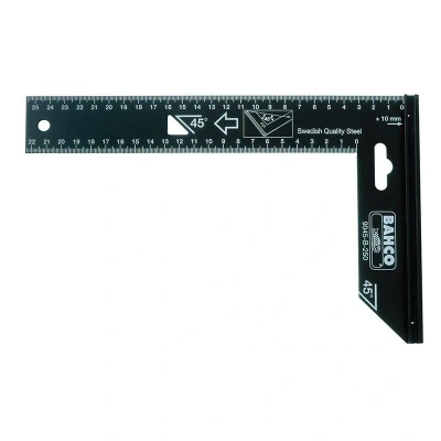 General description This is a precision carpenter's square made of high-quality steel, designed for accurate angle measurements. It is ideal for marking 45° and 90° angles in woodworking and DIY projects. The tool is durable, rust-resistant, and easy to read, ensuring precise and reliable results. Technical specifications Length: 300 mm Material: Steel, stamped from a single piece Finish: Black coated with anti-corrosion treatment, blued surface Graduations: Clear, scratch-resistant millimeter markings on both sides Calibration: Factory calibrated without certification Height: 170 mm Compatibility and accessories Suitable for use with standard woodworking tools and measuring devices No additional accessories required for basic use Installation No installation needed; simply place the square on the work surface for marking and measuring Usage Use to mark precise 45° and 90° angles in woodworking, carpentry, and DIY projects Ensure the tool is stable on the work surface for accurate
