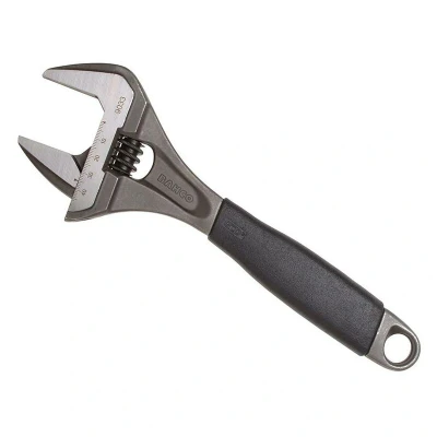 General description The Bahco 9033 250mm Ergo Extra Wide Jaw Adjustable Wrench is designed for professionals, featuring a 40% wider opening compared to standard adjustable wrenches of the same size. Its slim head design allows for accessibility while maintaining strength, making it ideal for plumbers and tradesmen who require portability in their tools. The wrench's jaws are angled at 15° to enhance access in confined spaces. Technical specifications Length: 250mm Jaw Width: 46.5mm Maximum opening capacity: 46.5mm Other information Precision-hardened and anti-corrosion treated with a black phosphated finish Comfortable slip-free warm thermoplastic handle Left-reading measurement scale in mm