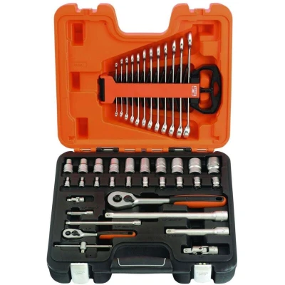 General description Bahco 1/4 & 1/2in Drive 41 piece metric socket and spanner set is a comprehensive tool kit designed for various DIY and professional applications. This set includes a wide range of sockets and spanners, making it suitable for different tasks. Technical specifications Drive Size: 1/4 & 1/2in Number of Sockets: 20 Set Type: Metric Socket Sizes: 1/4in Metric Sockets: 5, 5.5, 6, 7, 8, 9, 10, 11, 12 & 13mm; 1/2in Metric Sockets: 10, 12, 13, 14, 16, 17, 19, 21 & 24mm Extension Bars: 2 x 1/4in (50mm & 100mm), 2 x 1/2in (125mm & 250mm) Combination Spanners: 12 pieces (8, 9, 10, 11, 12, 13, 14, 15, 16, 17, 18 & 19mm) Sliding T-Bar: 1 x 1/4in (100mm) Universal Joints: 1 x 1/4in and 1 x 1/2in Case: Impact & Oil Resistant Case Tool Rack: Removable Tool Rack for Combination Spanners Other information