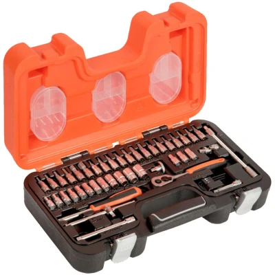 General description Bahco Metric Socket And Bit Set is a comprehensive 46-piece tool kit designed for versatility and efficiency. This 1/4in drive socket set features a dynamic drive profile, making it suitable for a wide range of applications. Technical specifications Drive size: 1/4in Material: Chrome vanadium Finish: Matt chrome-plated Case material: Oil and temperature resistant polypropene Contents: 46 pieces Compatibility and accessories 1/4in 6-pt dynamic drive sockets: 4, 4.5, 5, 5.5, 6, 7, 8, 9, 10, 11, 12, and 13mm 1/4in socket drivers: Phillips 1, 2, 3, 4 1/4in socket drivers: Flat 4, 5.5, 7mm 1/4in socket drivers: Hex 3, 4, 5, 6, 8, 10mm 1/4in socket drivers: TORX 8, 10, 15, 20, 25, 27, 30 1/4in sockets: TORX E6, E7, E8 1 x 1/4in spinner disc 2 x 1/4in extension bars: 2in and 4in 1 x 1/4in sliding T-bar 1 x 1/4in universal joint 1 x 1/4in spinner handle 1 x 1/4in flexible extension bar: 6in 1 each L-keys hex: 1.5, 2, 2.5mm 1 x 1/4in ratchet handle: 45-teeth